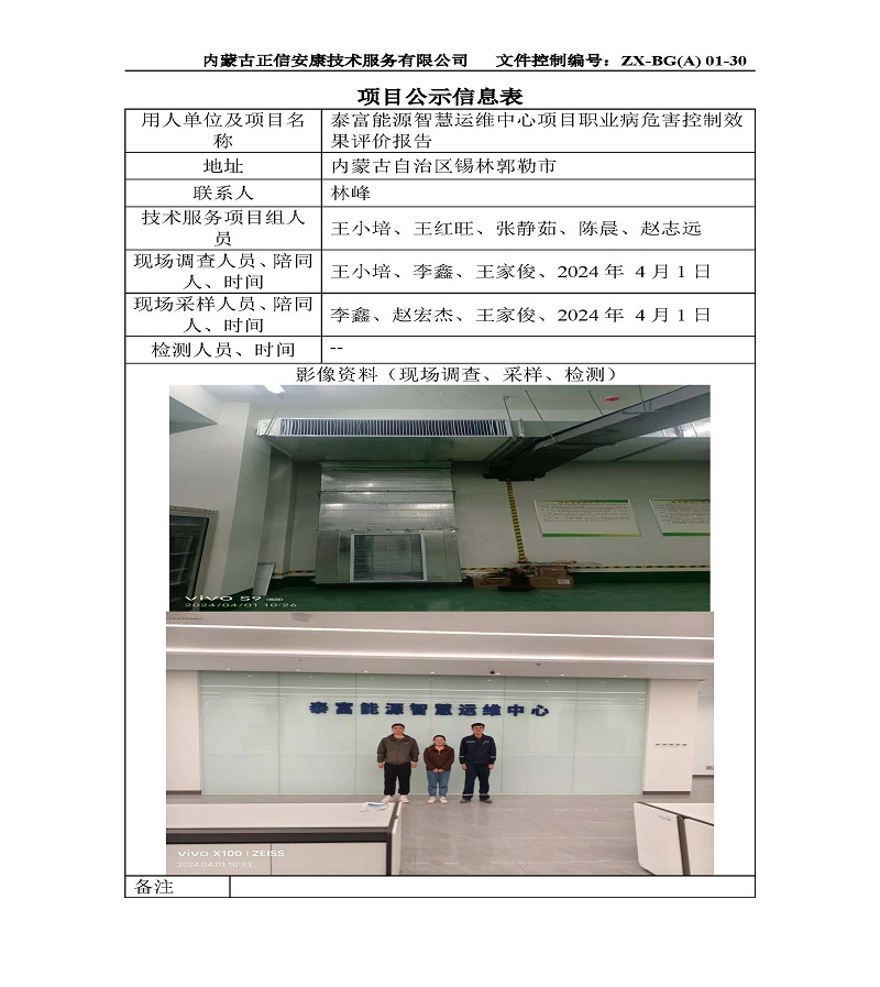 泰富能源智慧運(yùn)維中心項(xiàng)目職業(yè)病危害控制效果評(píng)價(jià)