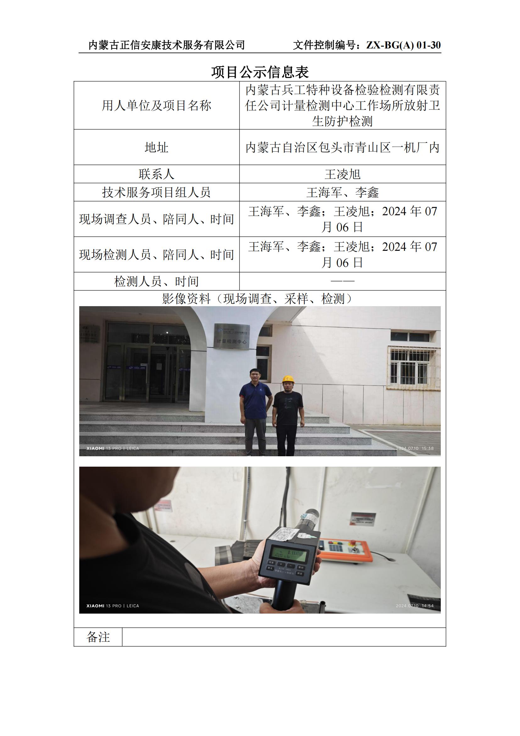 內(nèi)蒙古兵工特種設備檢驗檢測有限責 任公司計量檢測中心工作場所放射衛(wèi) 生防護檢測