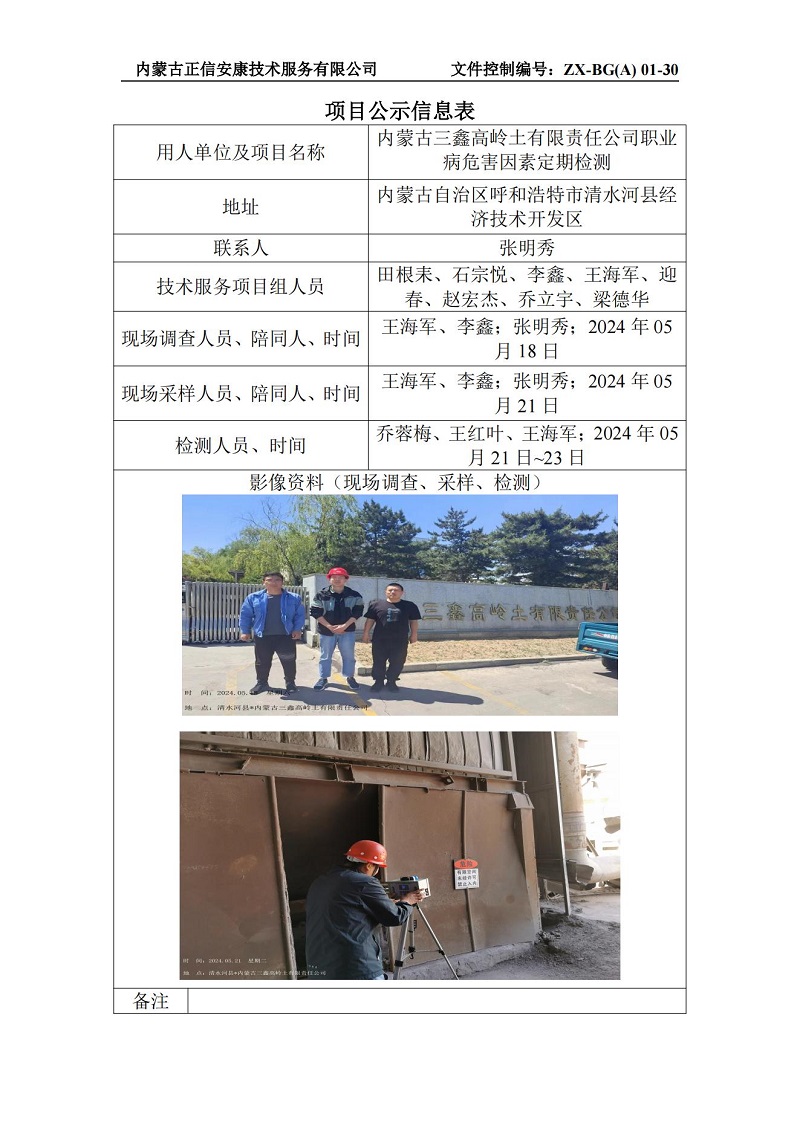內蒙古三鑫高嶺土有限責任公司職業(yè)病危害因素定期檢測