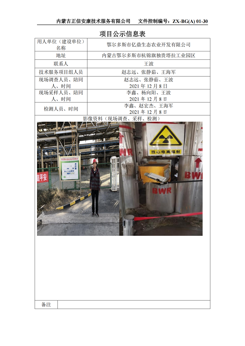 鄂爾多斯市億鼎生態(tài)農業(yè)開(kāi)發(fā)有限公司職業(yè)病危害放射防護現狀評價(jià)報告項目公示信息表