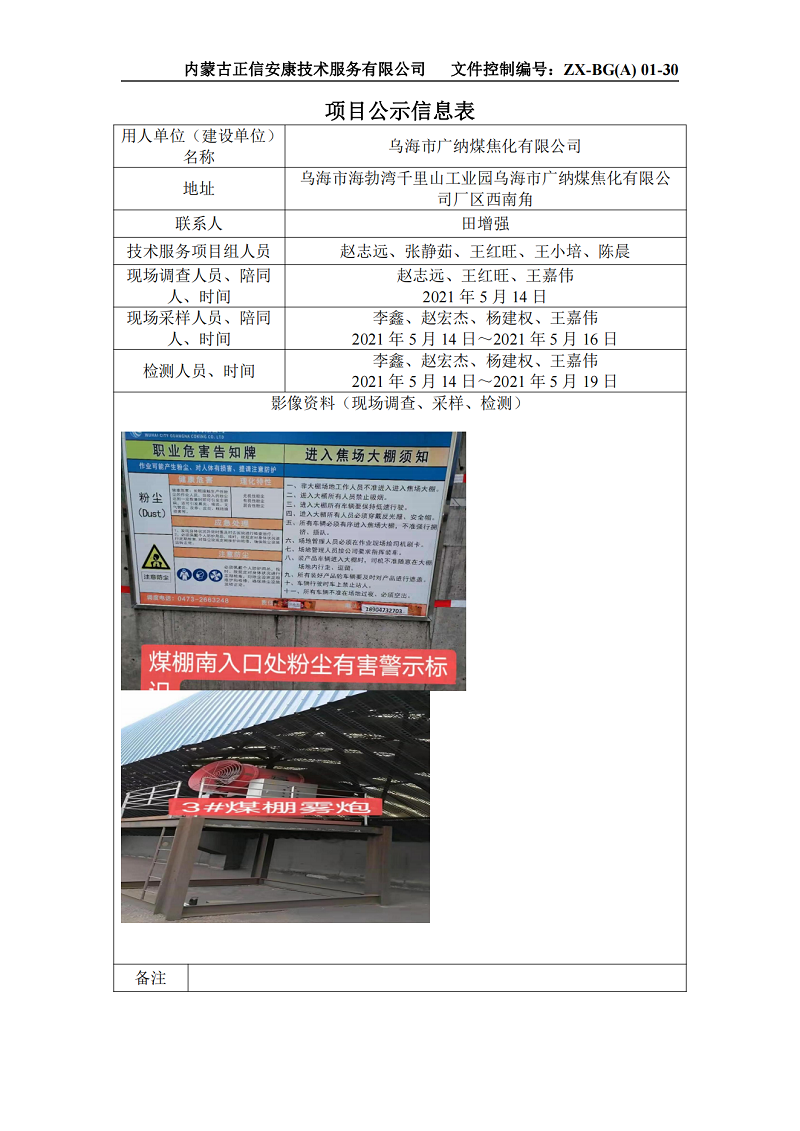 烏海市廣納煤焦化有限公司精煤堆場(chǎng)全封閉(三期)技改項目職業(yè)病危害控制效果評價(jià) 項目公示信息表