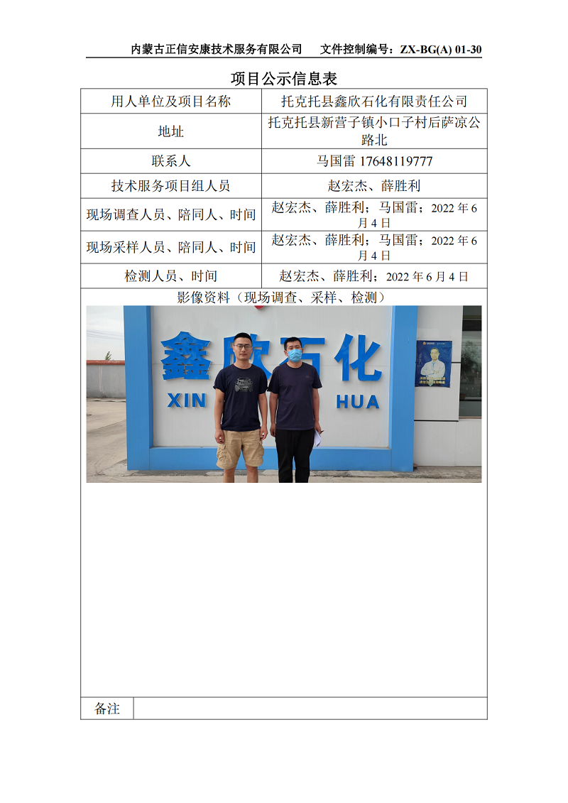 托克托縣鑫欣石化有限責任公司定期檢測項目公示信息表