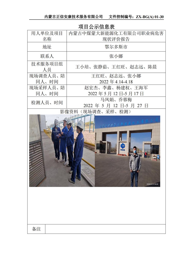 內蒙古中煤蒙大新能源化工有限公司職業(yè)病危害現狀評價(jià)報告書(shū)公示信息表