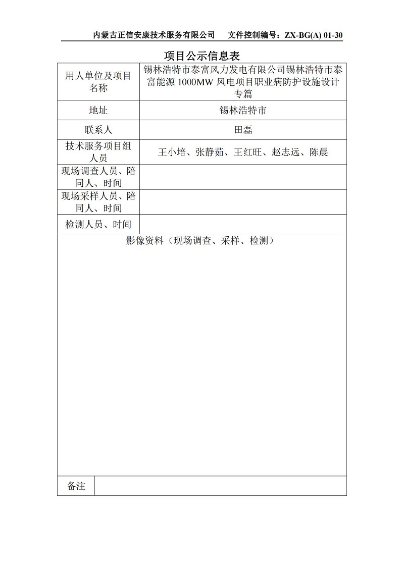 錫林浩特市泰富風(fēng)力發(fā)電有限公司錫林浩特市泰富能源1000MW風(fēng)電項目職業(yè)病防護設施設計專(zhuān)篇公示信息表