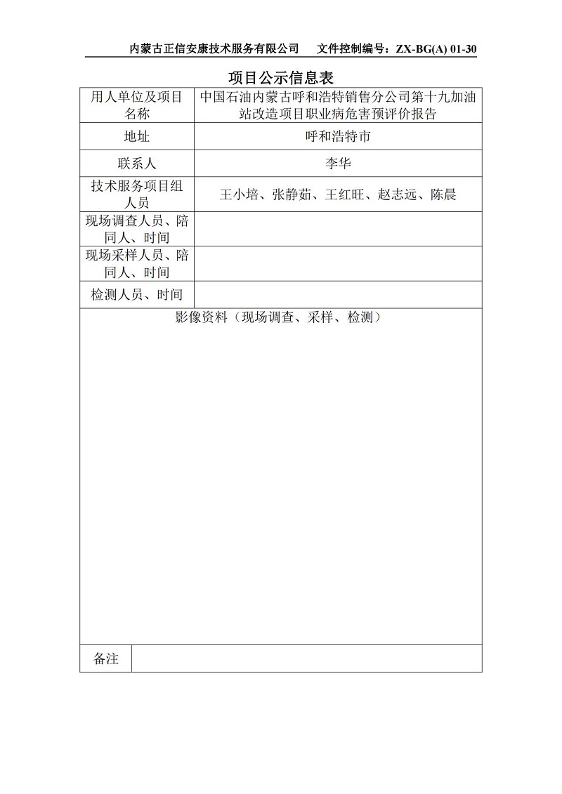 中國石油內蒙古呼和浩特銷(xiāo)售分公司第十九加油站改造項目職業(yè)病危害預評價(jià)報告公示信息表