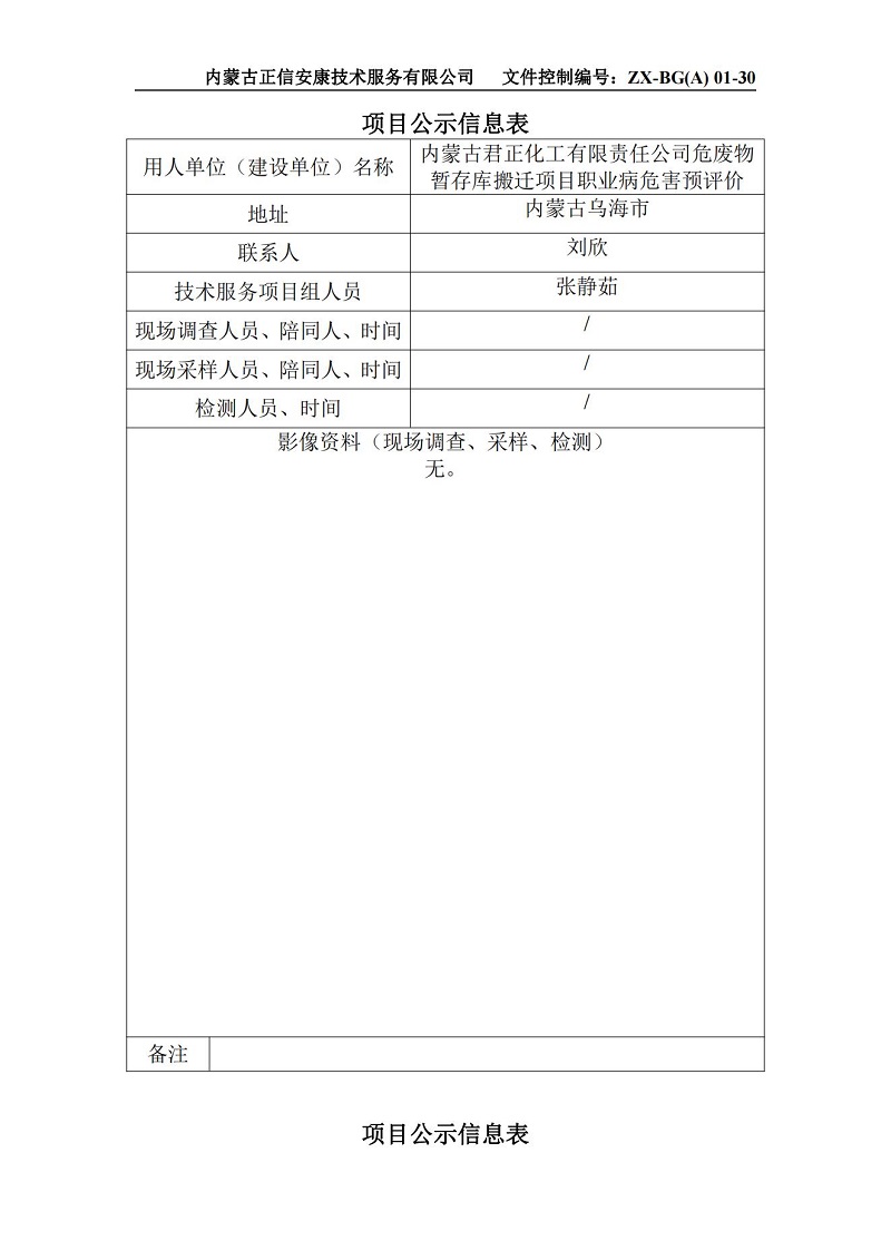 內蒙古君正化工有限責任公司危廢物暫存庫搬遷項目職業(yè)病危害預評價(jià)