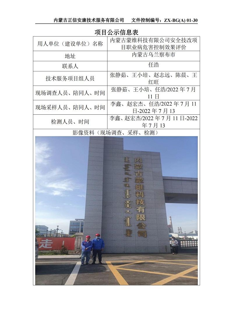 內蒙古蒙維科技有限公司安全技改項目職業(yè)病危害控制效果評價(jià)項目公示