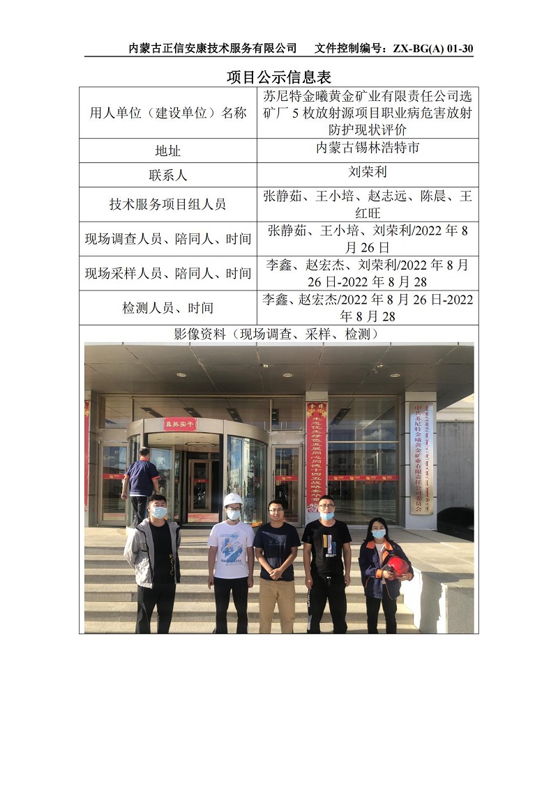 蘇尼特金曦黃金礦業(yè)有限責任公司選礦廠(chǎng)5枚放射源項目職業(yè)病危害放射防護現狀評價(jià)項目公示