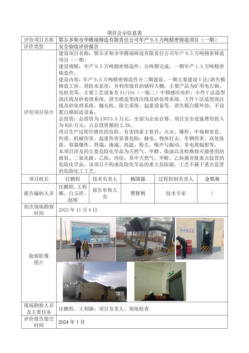 鄂爾多斯市華騰瑞鑄造有限責任公司年產(chǎn)9.5萬(wàn)噸精密鑄造項目(一期)安全驗收_