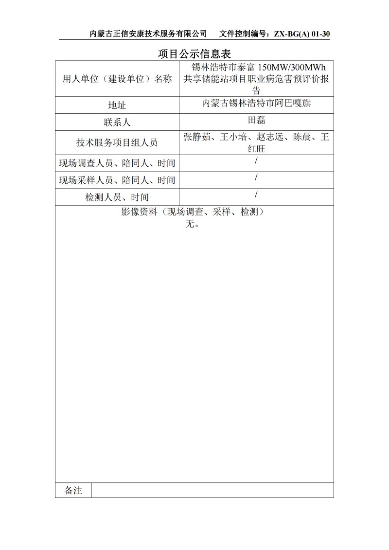 錫林浩特市泰富150MW300MWh共享儲能站項目職業(yè)病危害預評價(jià)公示信息
