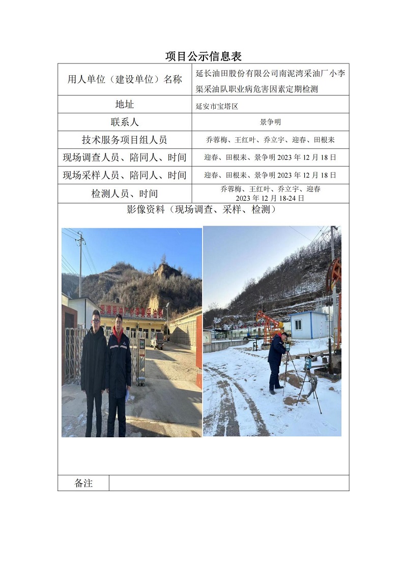 延長(zhǎng)油田股份有限公司南泥灣采油廠小李渠采油隊(duì)職業(yè)病危害因素定期檢測(cè)