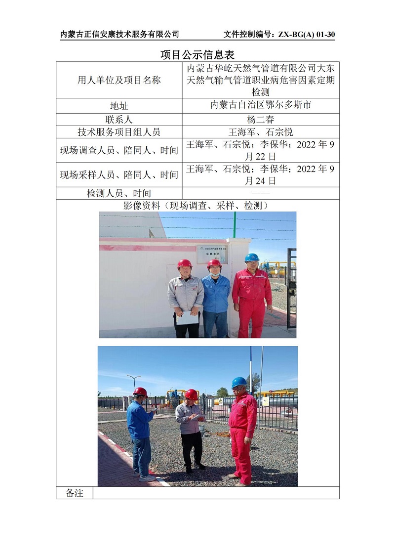 內蒙古華屹天然氣管道有限公司大東天然氣輸氣管道職業(yè)病危害因素定期檢測信息公示