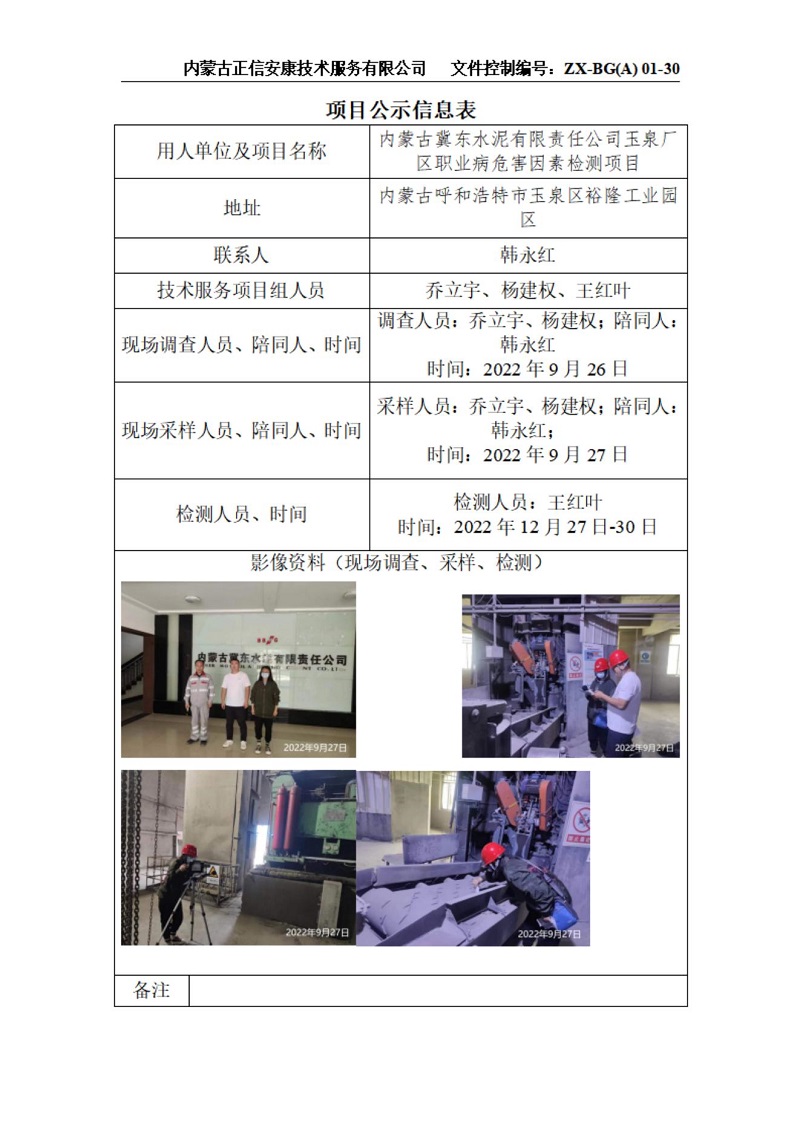 內蒙古冀東水泥有限責任公司玉泉廠(chǎng)區職業(yè)病危害因素檢測項目公示信息表