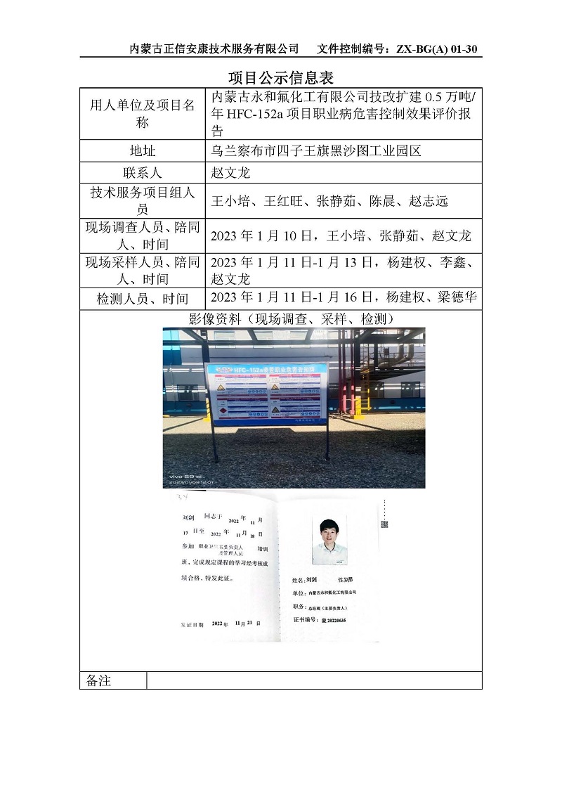內蒙古永和氟化工有限公司技改擴建0.5萬(wàn)噸年HFC-152a項目職業(yè)病危害控制效果評價(jià)公示表