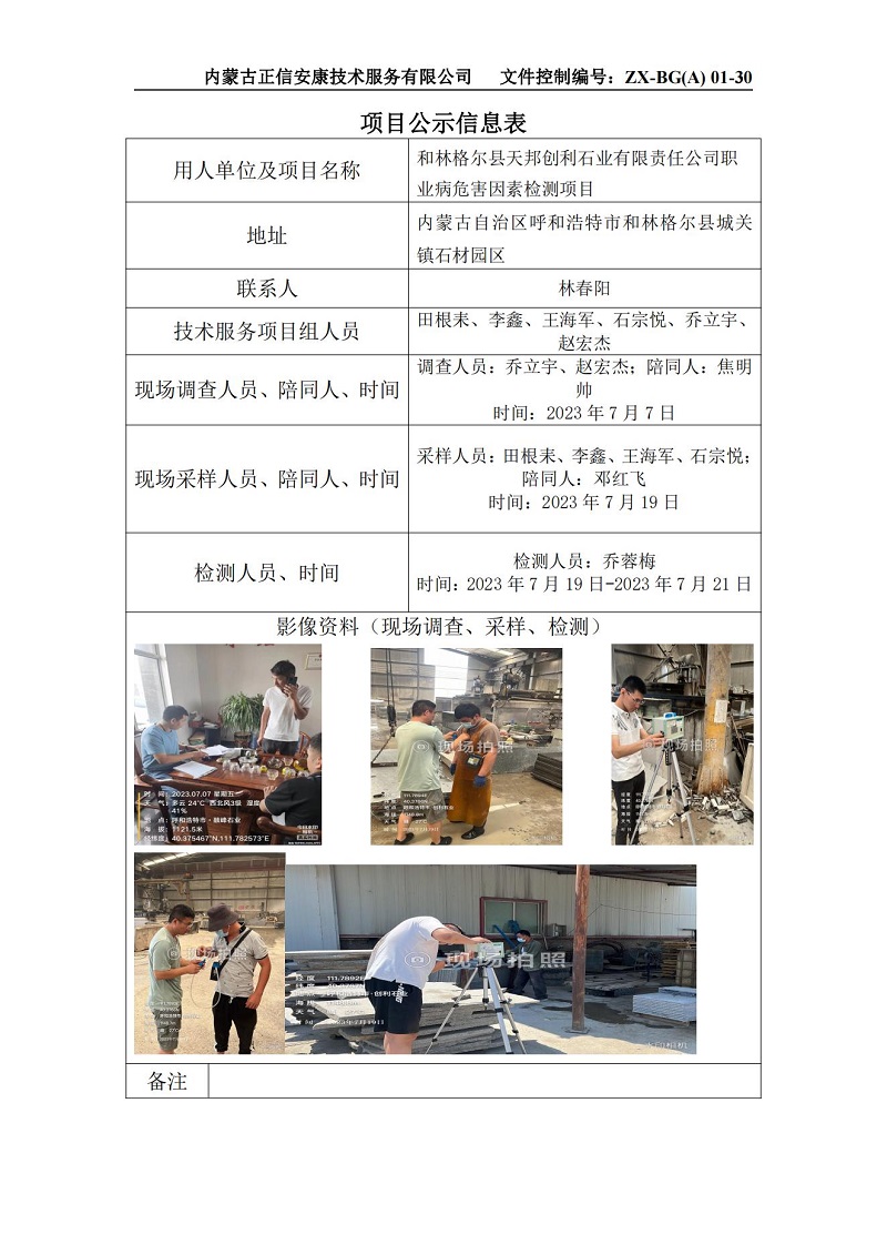 和林格爾縣天邦創(chuàng )利石業(yè)有限責任公司職業(yè)病危害因素檢測項目公示信息表