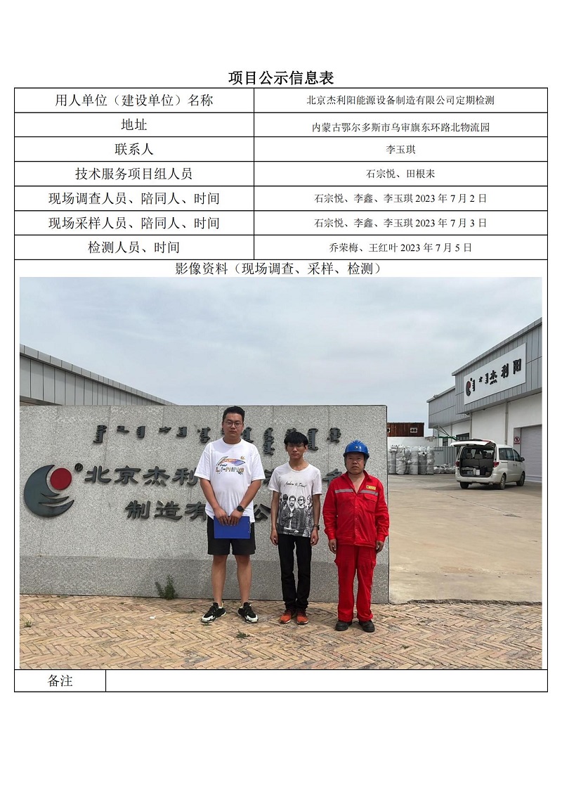 北京杰利陽(yáng)能源設備制造有限公司定期檢測公示信息表