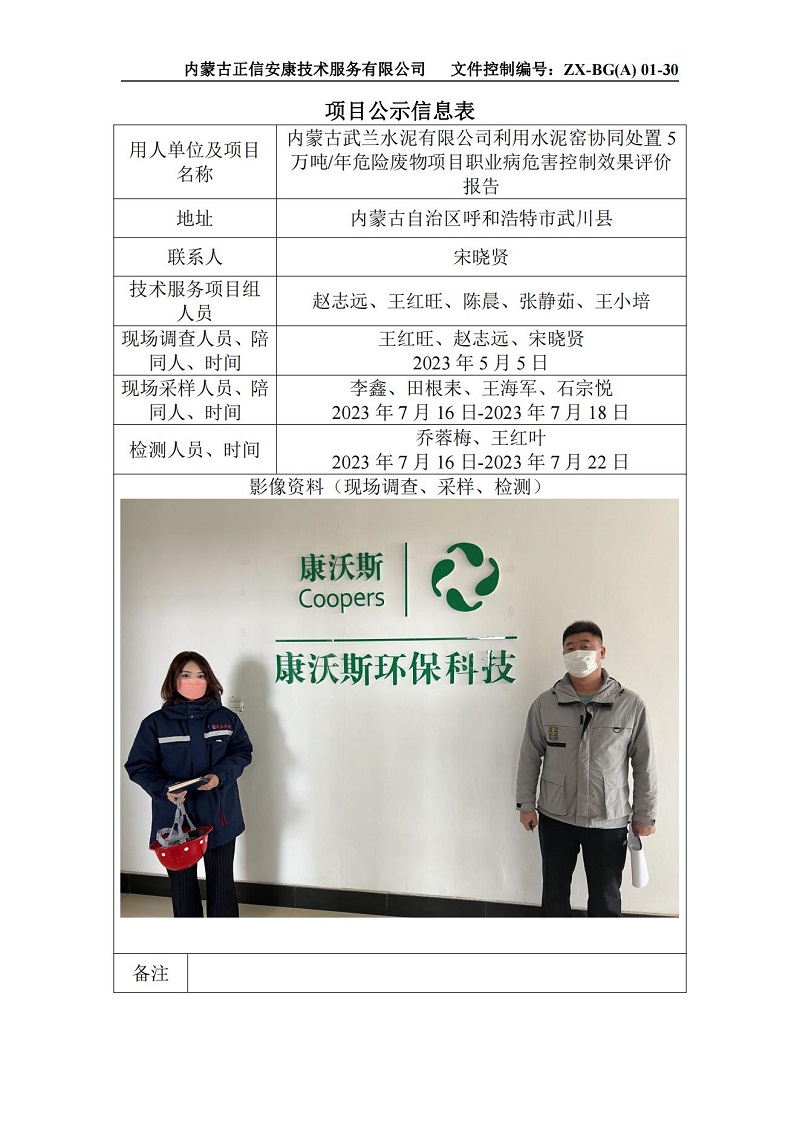 內蒙古武蘭水泥有限公司利用水泥窯協(xié)同處置5萬(wàn)噸年危險廢物項目職業(yè)病危害控制效果評價(jià)報告-項目公示信息表