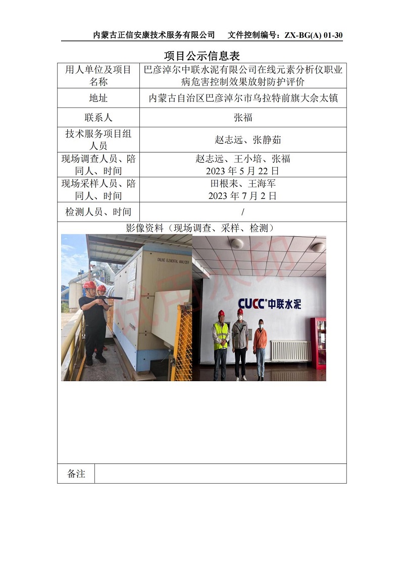 巴彥淖爾中聯(lián)水泥有限公司在線(xiàn)元素分析儀職業(yè)病危害控制效果放射防護評價(jià)-項目公示信息表