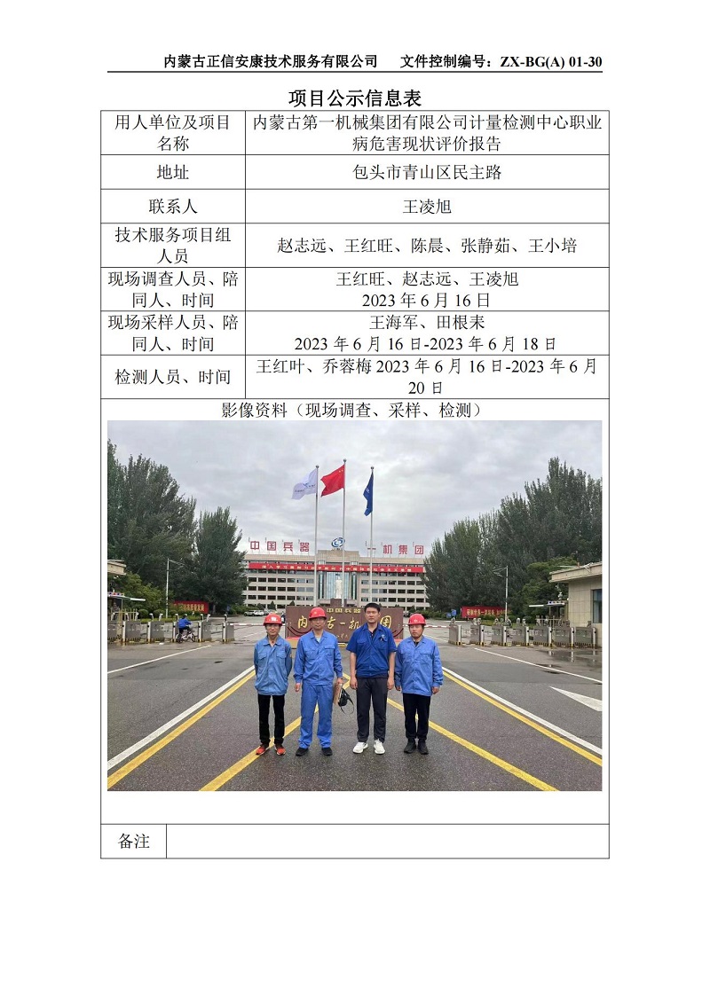 內蒙古第一機械集團有限公司計量檢測中心職業(yè)病危害現狀評價(jià)報告-項目公示信息表_
