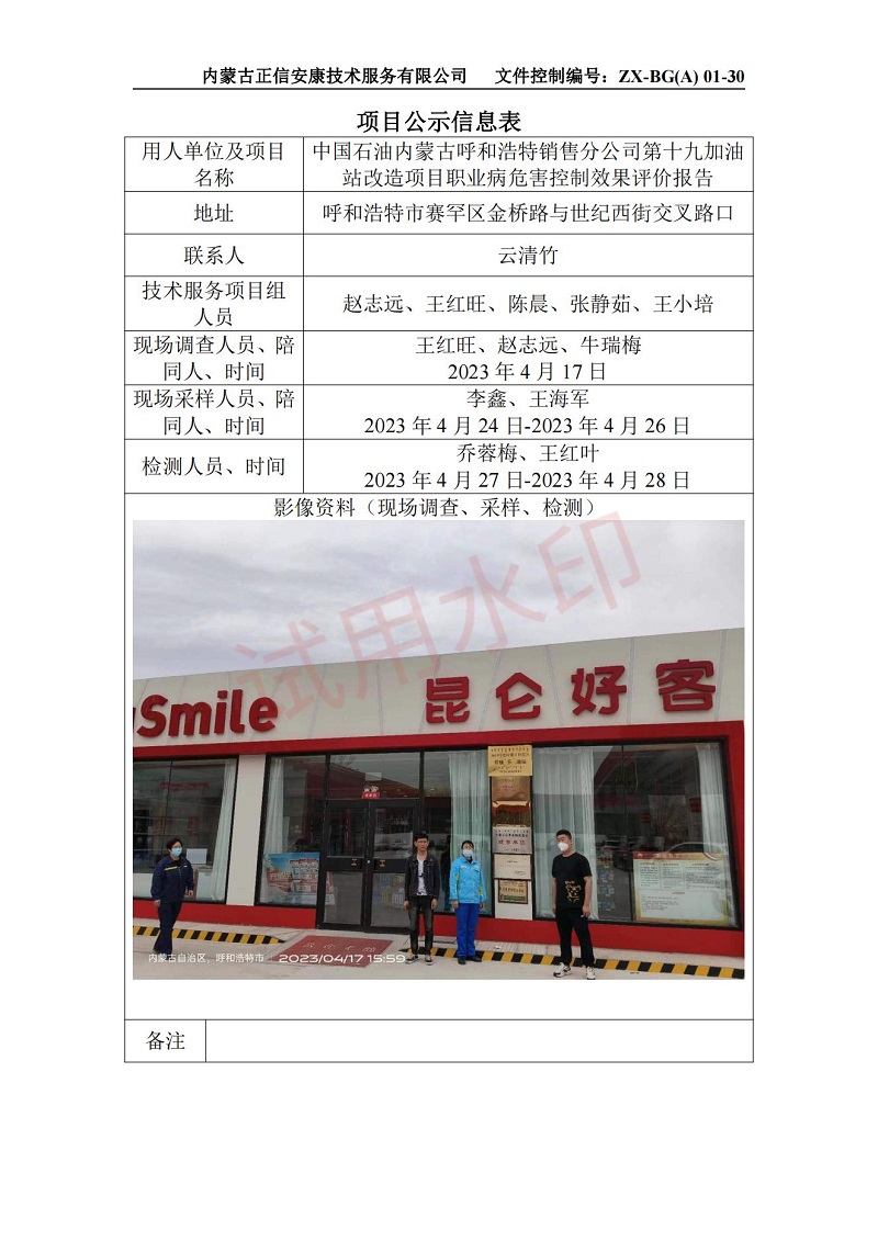 中國石油內蒙古呼和浩特銷(xiāo)售分公司第十九加油站改造項目職業(yè)病危害控制效果評價(jià)報告-項目公示信息表