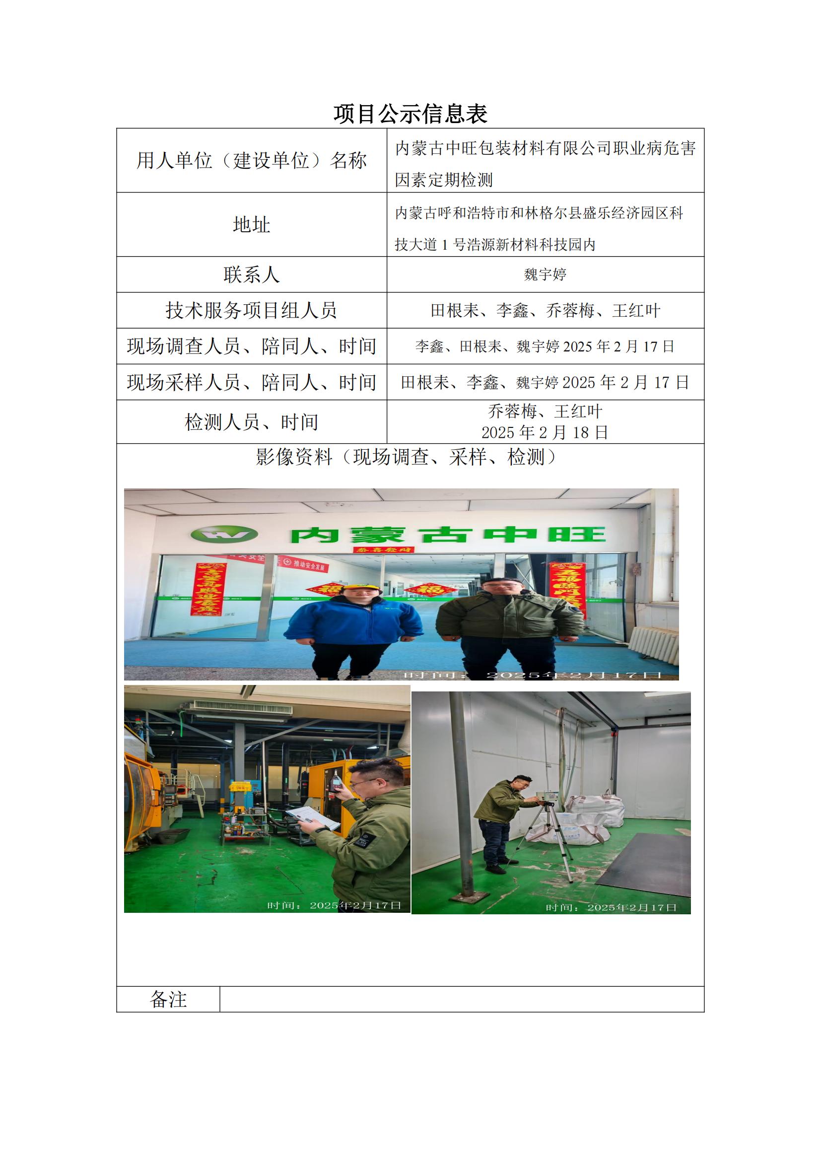 當前位置:首頁(yè)>>項目公示>>內蒙古中旺包裝材料有限公司職業(yè)病危害因素定期檢測 項目公示