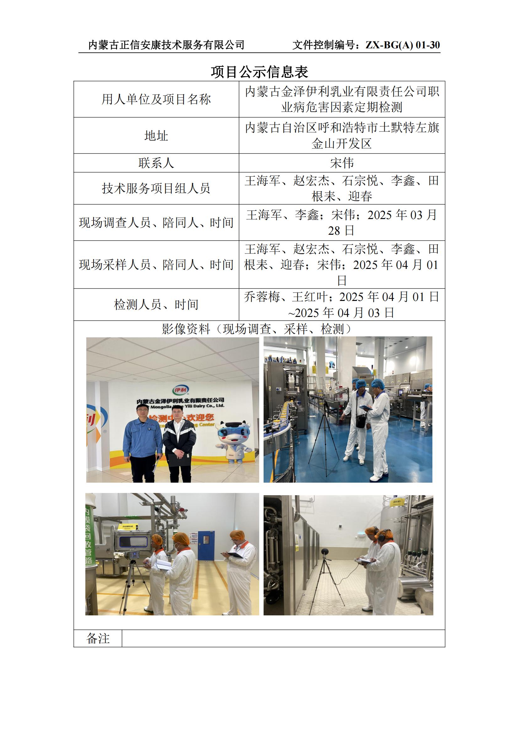內蒙古金澤伊利乳業(yè)有限責任公司職業(yè)病危害因素定期檢測
