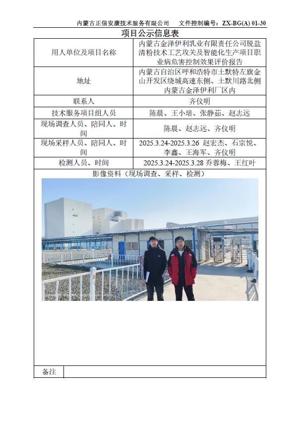 內蒙古金澤伊利乳業(yè)有限責任公司脫鹽清粉技術(shù)工藝攻關(guān)及智能化生產(chǎn)項目職業(yè)病危害控制效果評價(jià)報告