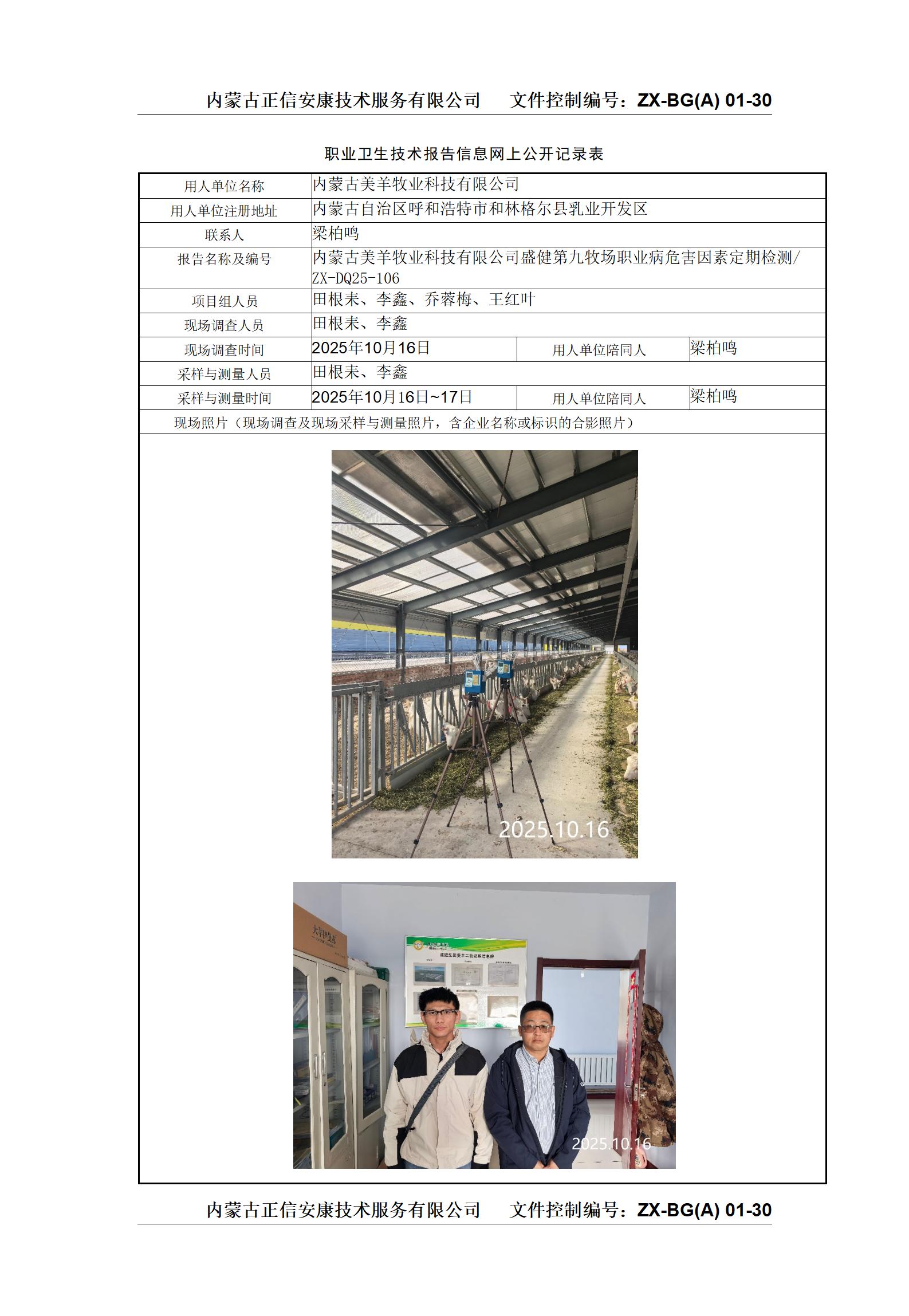 內蒙古美羊牧業(yè)科技有限公司盛健第九牧場(chǎng)職業(yè)病危害因素定期檢測