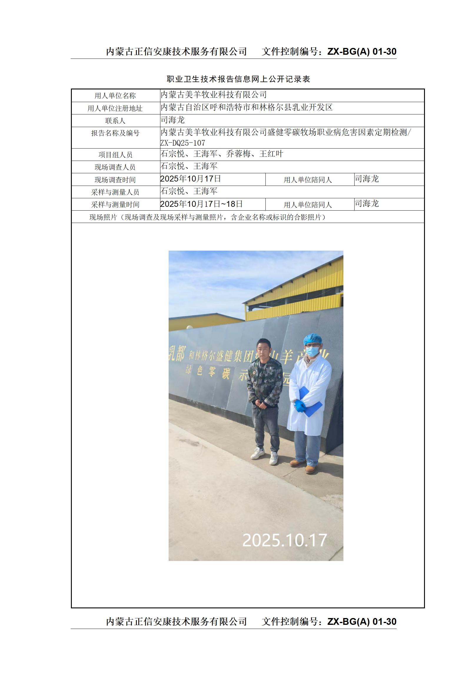 內蒙古美羊牧業(yè)科技有限公司盛健零碳牧場(chǎng)職業(yè)病危害因素定期檢測